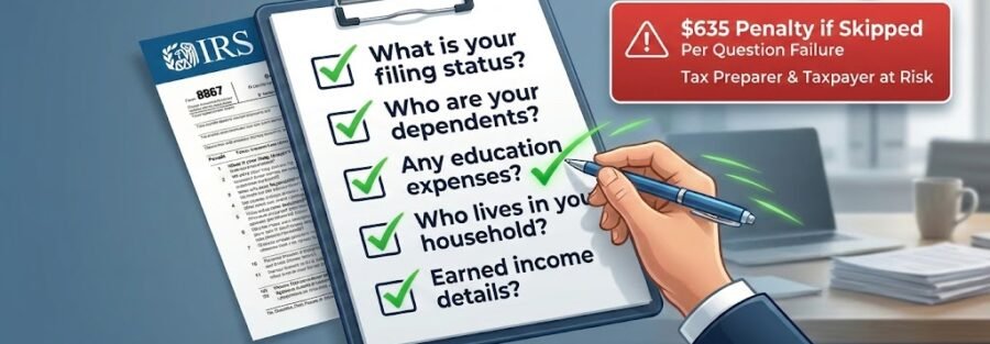 How do I know if my tax preparer is doing their job properly? If your tax preparer is not asking you detailed questions every single year about your dependents, filing status, education expenses, and household situation, that’s a red flag. A compliant preparer will ask these questions to properly complete Form 8867 and protect both of you from IRS penalties.